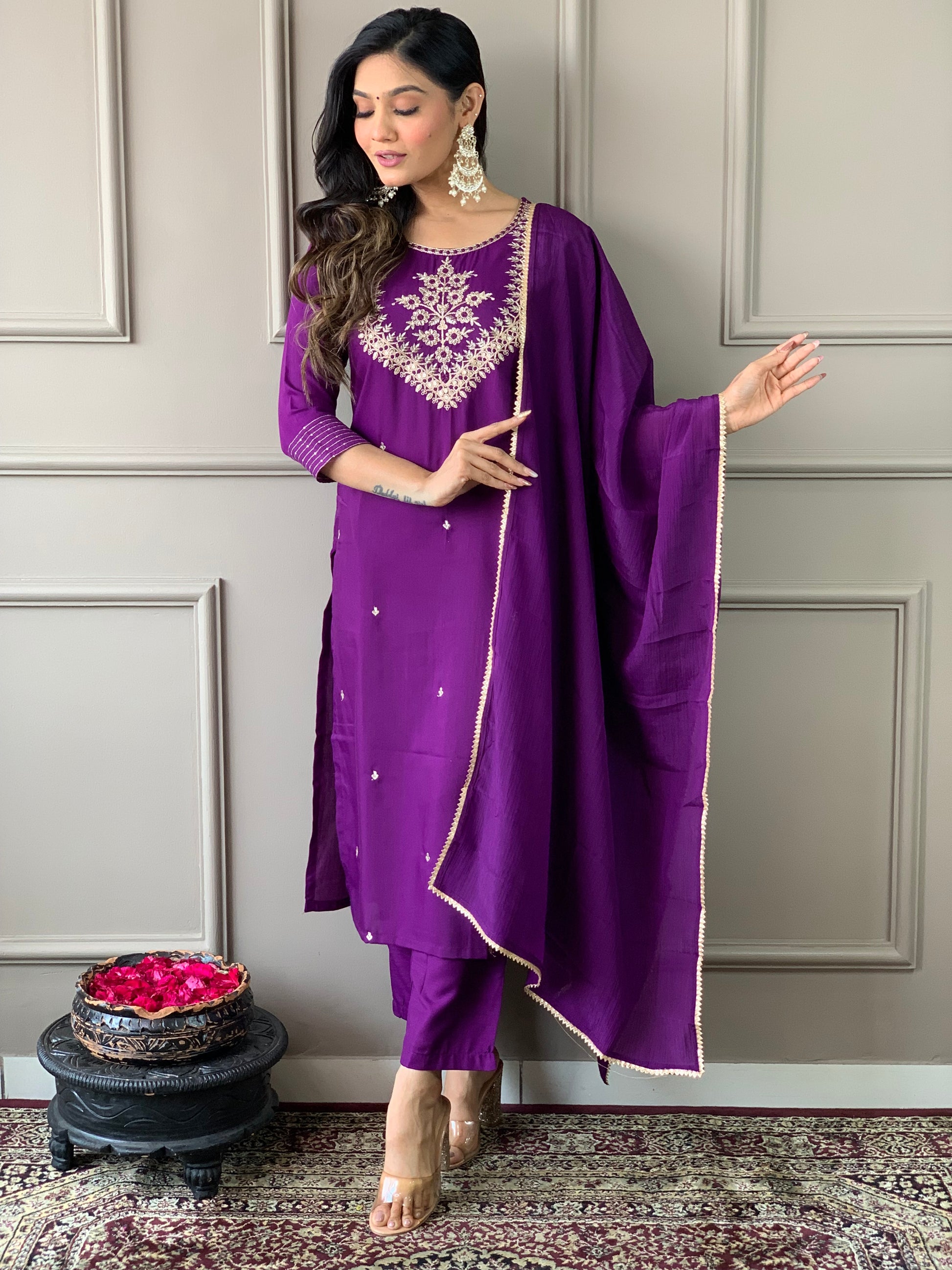 Phenomenal Purple Pure Rayon Embroidery Suit Set