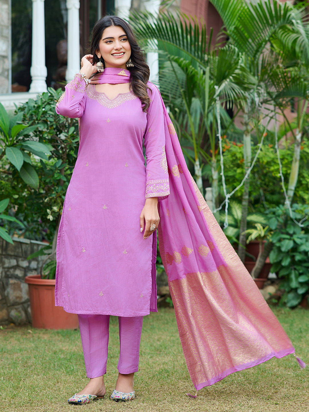 Trendy Viscose Chanderi Embroidery Suit Set With Jequard Dupatta